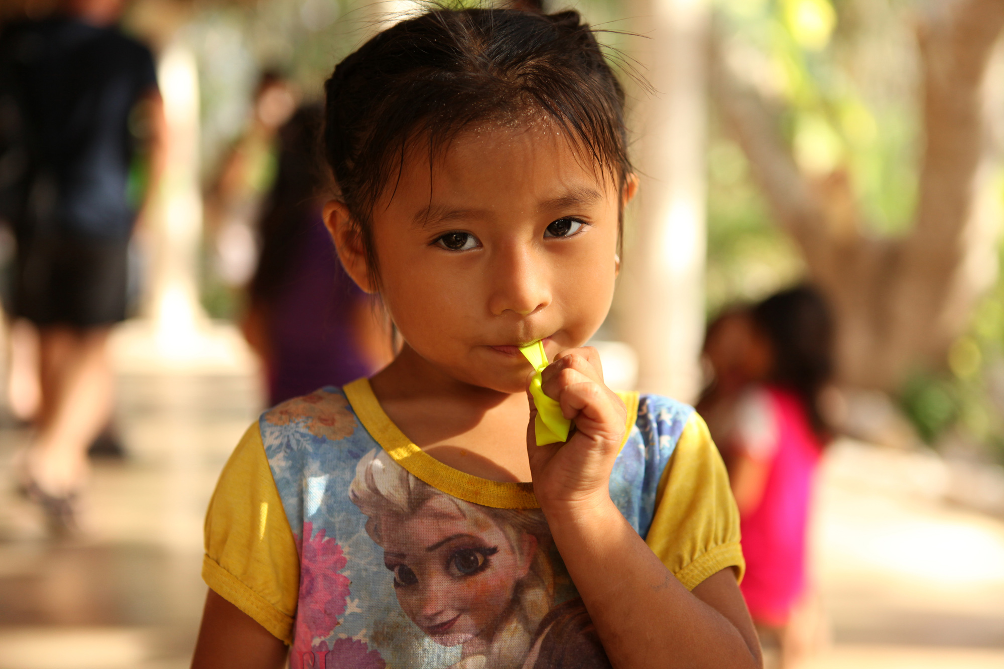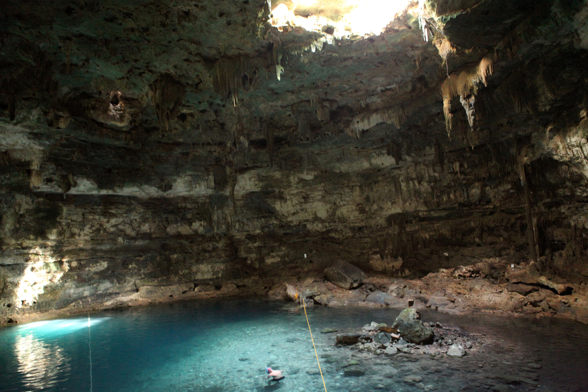 Teraz marzyliśmy już tylko o tym, żeby schłodzić się w wodzie, a plan zakładał ostatni przystanek przed miejscem docelowym właśnie w cenote Ik Kil. Cenote to rodzaj naturalnej studni krasowej utworzonej w skale wapiennej, występujący szczególnie często właśnie na Jukatanie. Są one połączone z podziemnymi zasobami wody gruntowej i niekoniecznie posiadają lustro wodne widoczne na powierzchni, lecz najbardziej znane są duże, otwarte. Sęk w tym, że Ik Kil jest masowo oblegany, więc nasz niezłomny Jose wyszedł z inicjatywą zmiany planów i zaproponował, że zabierze nas do równie pięknych, ale mniej popularnych cenotów X’kekén y Samula leżących bliżej Valladolid (bilet wstępu 80 MXN dla osoby dorosłej). Nic nie było w stanie mnie powstrzymać przed kąpielą w chłodnej słodkiej wodzie studni, połączonej ze światem zewnętrznym tylko małym otworem, przez które wkradały się jak lasery snopy słonecznego światła. Po wysuszeniu spotkaliśmy jeszcze grupkę dzieciaków biegających w okolicy. Koleżanka na szczęście miała przy sobie sporą siatkę rzeczy, które dzieci po prostu rozchwytywały, jak np. zeszyty, kredki, długopisy. Lżejsi o przybory szkolne wyjechaliśmy w kierunku wybrzeża.