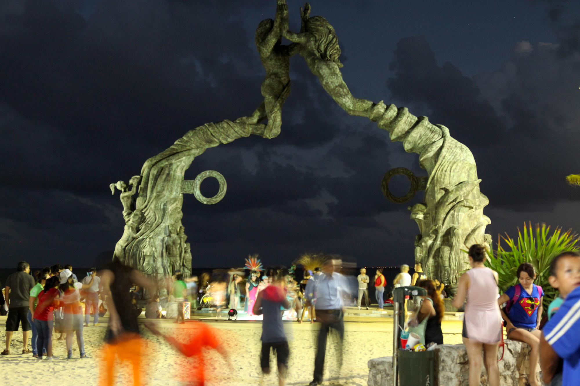 Główna ulica prostopadła do brzegu to Avenida Juarez (na południe od 2 Norte). Wychodzi ona na główną miejską plażę, przy której jest mały placyk z ładnym małym kościółkiem i charakterystycznym łukiem Portal Maya. Na placu stoi też 30-metrowy maszt, na którym odbywają się wieczorami przedstawienia Voladores de Papantla. Jest to typowy taniec meksykański na linach pochodzący z Veracruz, ale przedstawiany wszędzie w Meksyku. Zaraz obok znajduje się port, skąd odpływają promy kursujące między Playa del Carmen a wyspą Cozumel.