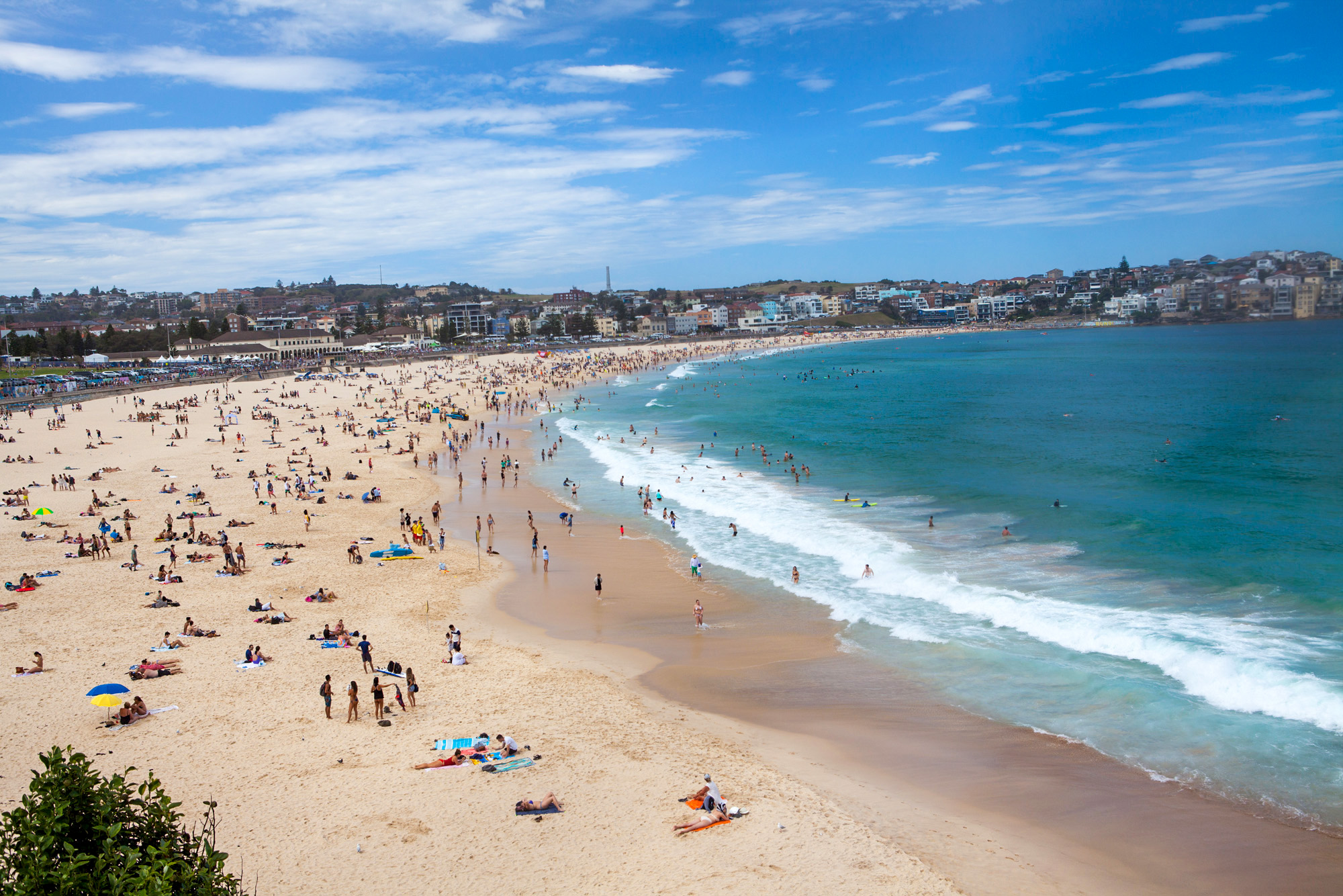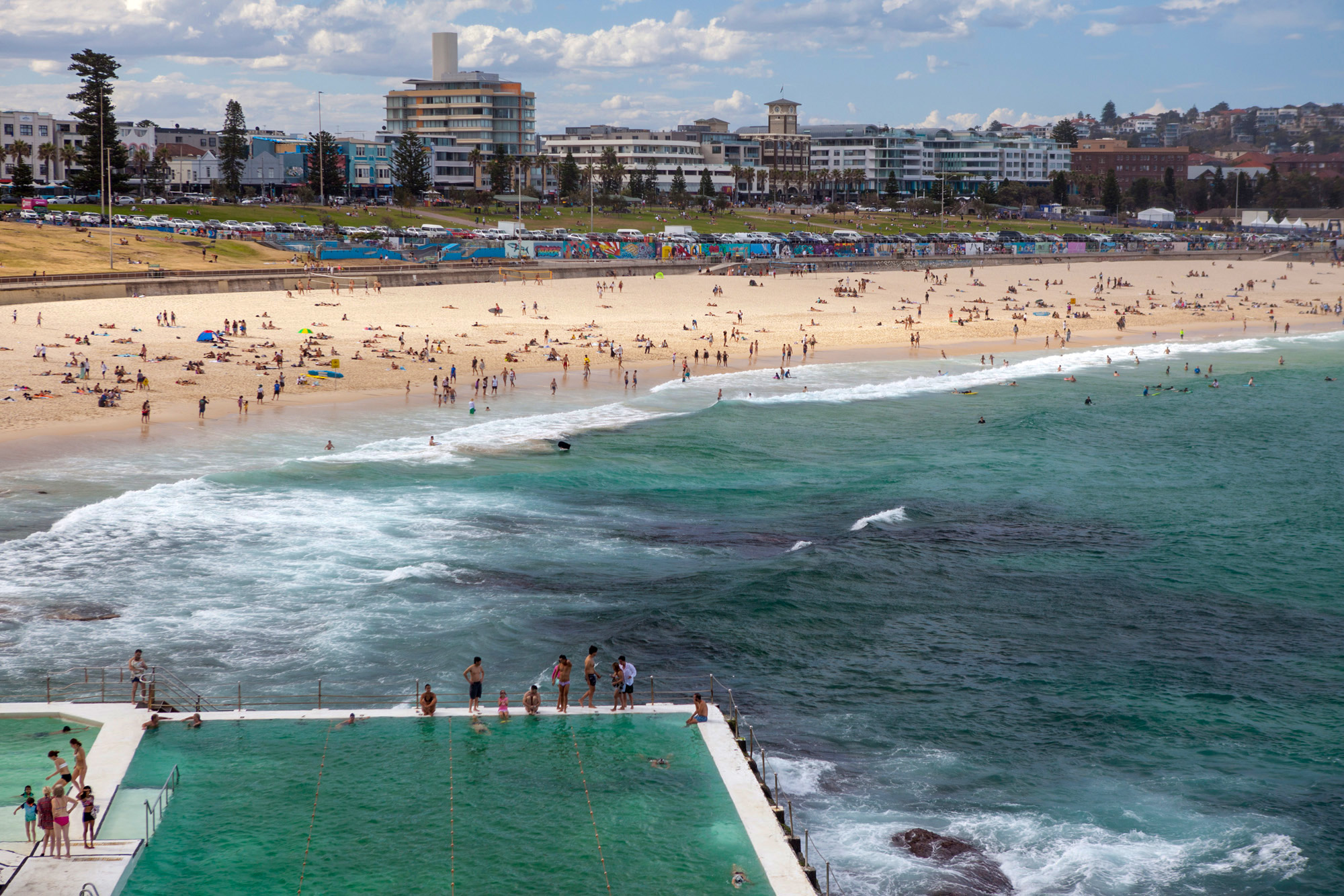 Druga z najważniejszych plaż w Sydney to Bondi Beach. Została sklasyfikowana przez National Geographic na 8. miejscu wśród najlepszych plaż miejskich na świecie. Tu też często panują wspaniałe warunki do uprawiania surfingu. Plaża ciągnie się na długości kilometra. Dostać się na nią można jadąc najpierw koleją do Bondi Junction, a następnie autobusem miejskim. Niemiłą niespodzianką było to, że autobusy często są przepełnione, a wtedy kierowcy w ogóle nie zatrzymują się na przystankach! My po kilkudziesięciu minutach oczekiwania poddaliśmy się i zdecydowaliśmy się na 2,5-kilometrowy spacer. Znakiem rozpoznawczym plaży od ponad 100 lat są Bondi Baths, znajdujące się przy jej południowym krańcu efektowne baseny.