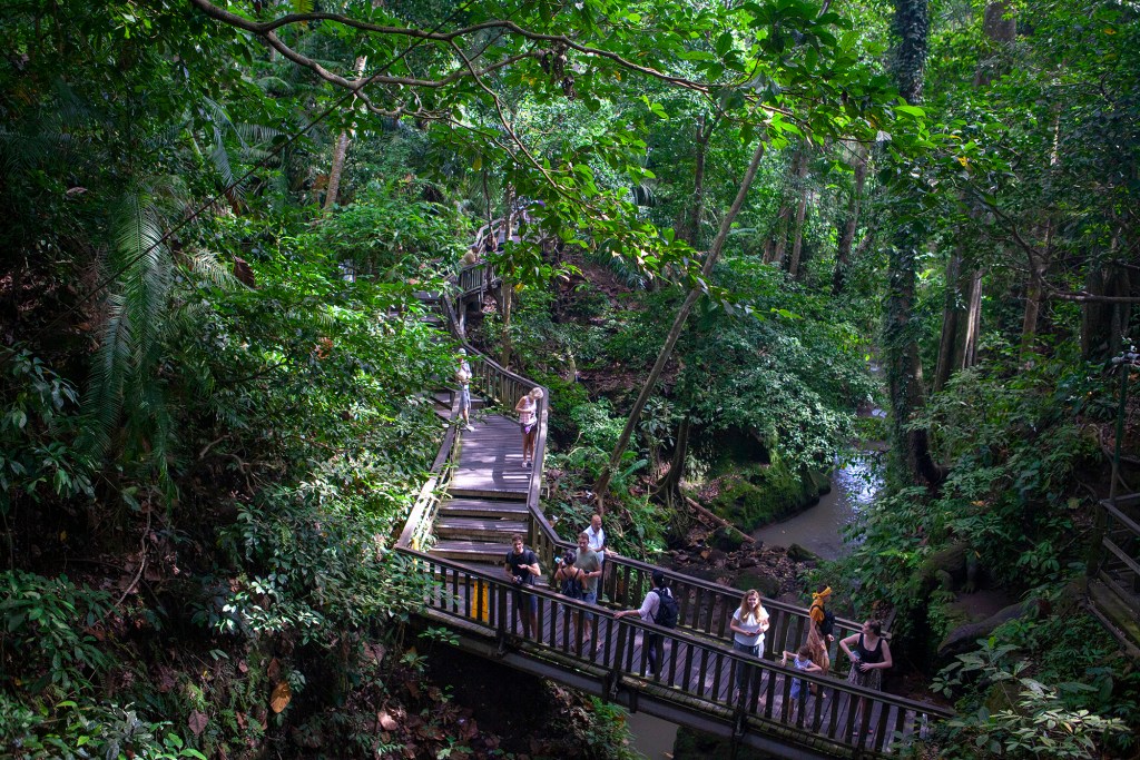 Jednym z ciekawszych miejsc, które warto zobaczyć w Ubud jest Monkey Forest, czyli Małpi Las, choć właściwa nazwa, którą znajdziecie na biletach wstępu to Mandala Suci Wenara Wana. Warto tu przyjść nie tylko dla małp, choć jest ich tu całkiem sporo, podobno nawet ponad pół tysiąca. Małpi las to doskonały sposób na spędzenie kilku godzin w lesie tropikalnym. Ścieżki wytyczone są pośród gęstych zarośli i strumyków. Na terenie kompleksu są też świątynie, choć niedostępne do zwiedzania dla turystów. Warto pamiętać o pochowaniu wszystkich przedmiotów, a w szczególności artykułów spożywczych głęboko do plecaka. Jakiekolwiek wystające elementy mogą być pretekstem dla ciekawskich makaków do zainteresowania się naszym dobytkiem. Na szczęście w naszym przypadku obyło się bez żadnych niespodzianek i bezpiecznie zwiedziliśmy Monkey Forest.