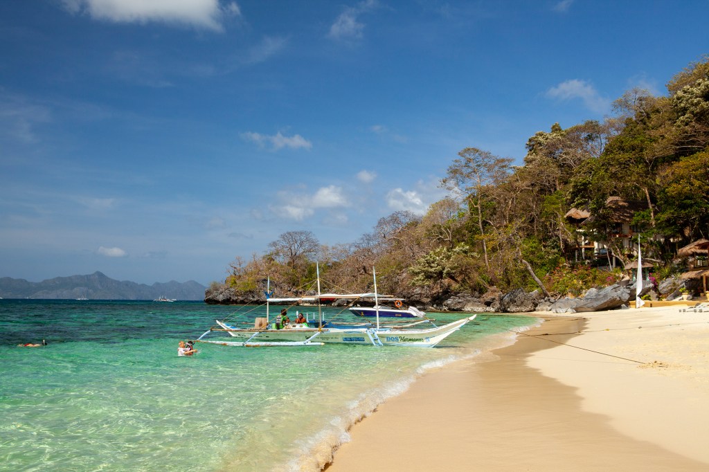 Największą jednak atrakcją El Nido są wycieczki po okolicznych wysepkach, błękitnych lagunach i ukrytych plażach. Oferta biur podróży jest mocno wystandaryzowana, do wyboru mamy cztery opcje trasy: od A do D. Najczęściej polecanymi są dwie: A i C. My zdecydowaliśmy się na pierwszą z brzegu. Tym razem również przy naszej grupie mogliśmy się cieszyć prywatną łodzią i możliwością elastycznego zaplanowania szczegółów trasy. Okazało się to bardzo przydatne, bo ze względu na duże fale tego popołudnia, zamieniliśmy Big Lagoon na wspaniałą plażę przy Cadlao Island.