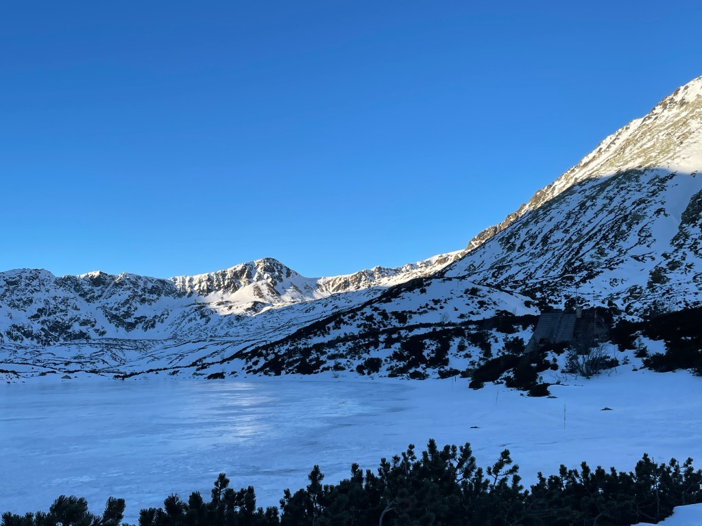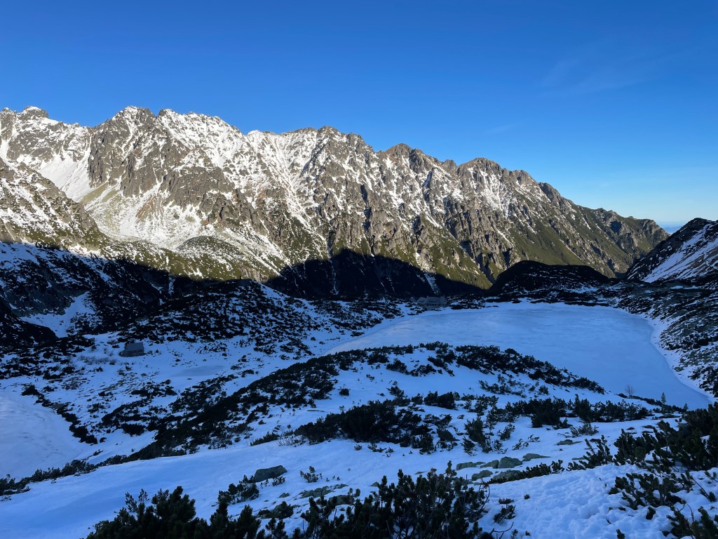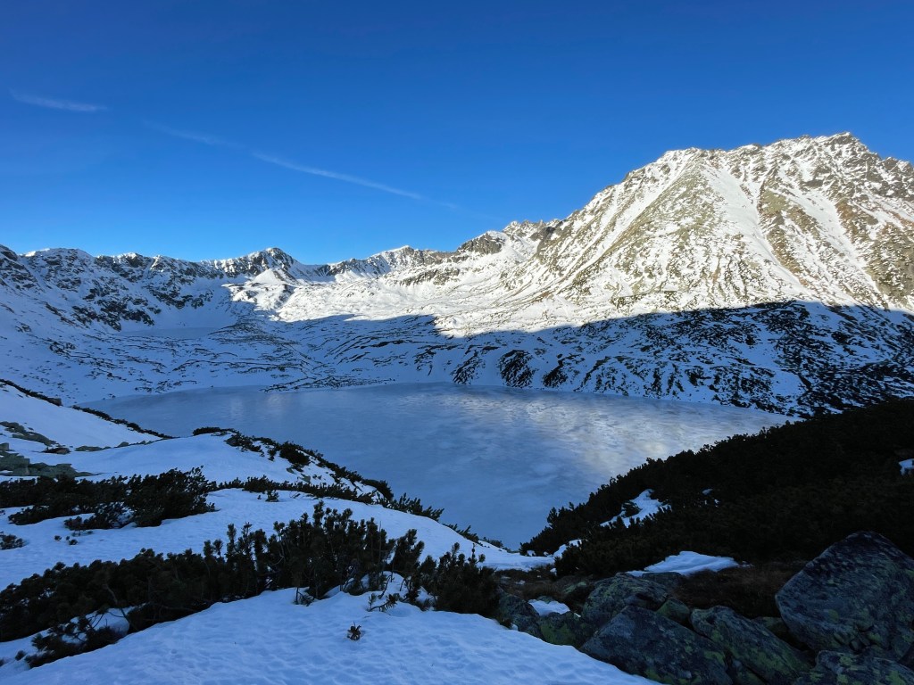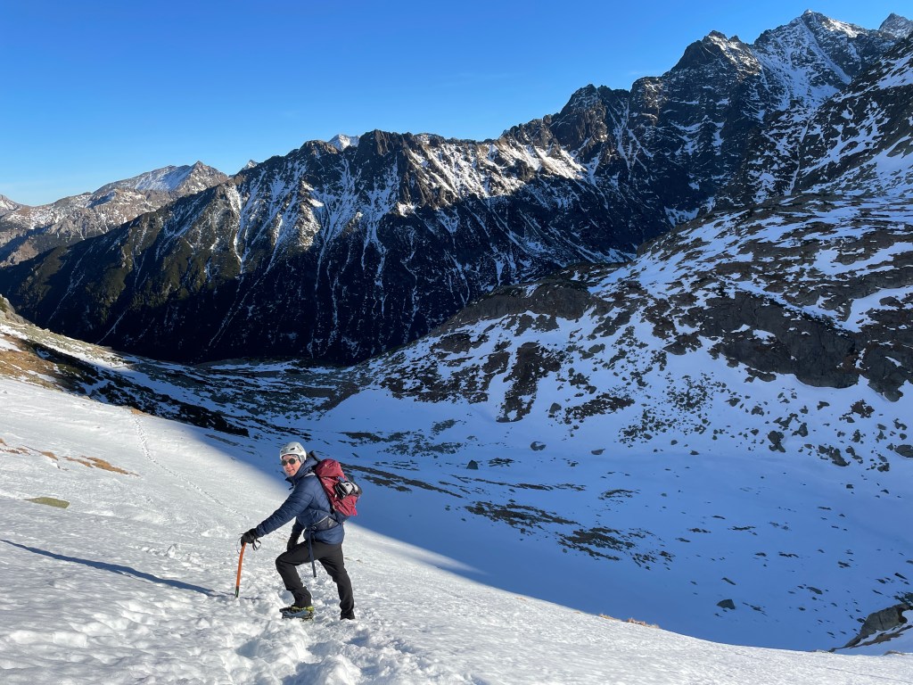 Klamka zapadła, Szpiglas potwierdzony. Posileni i uspokojeni wyruszamy ze schroniska o wpół do dziesiątej. Pogoda przepiękna, bezchmurne niebo, brak wiatru. Idziemy cały czas w cieniu, słońce chowa się za szczytem Miedzianego. Okrążamy Przedni Staw i zaraz za nim skręcamy w lewo mniej więcej zgodnie z zimowym wariantem szlaku. Tu już nie ma oznaczeń, więc co jakiś czas sprawdzam kurs na GPS-ie. Tutaj spotykamy dziewczyny, które potwierdzają, że cały szlak jest stabilny i pewny. Nie powinno być trudności. Pniemy się na bulę Niedźwiedzia, trawersując następnie zbocza Miedzianego. Co chwilę zachwycamy się widokami na dolinę i zamarznięte stawy, w których odbijają się sylwetki masywnych ścian Koziego Wierchu i sąsiednich szczytów Orlej Perci.