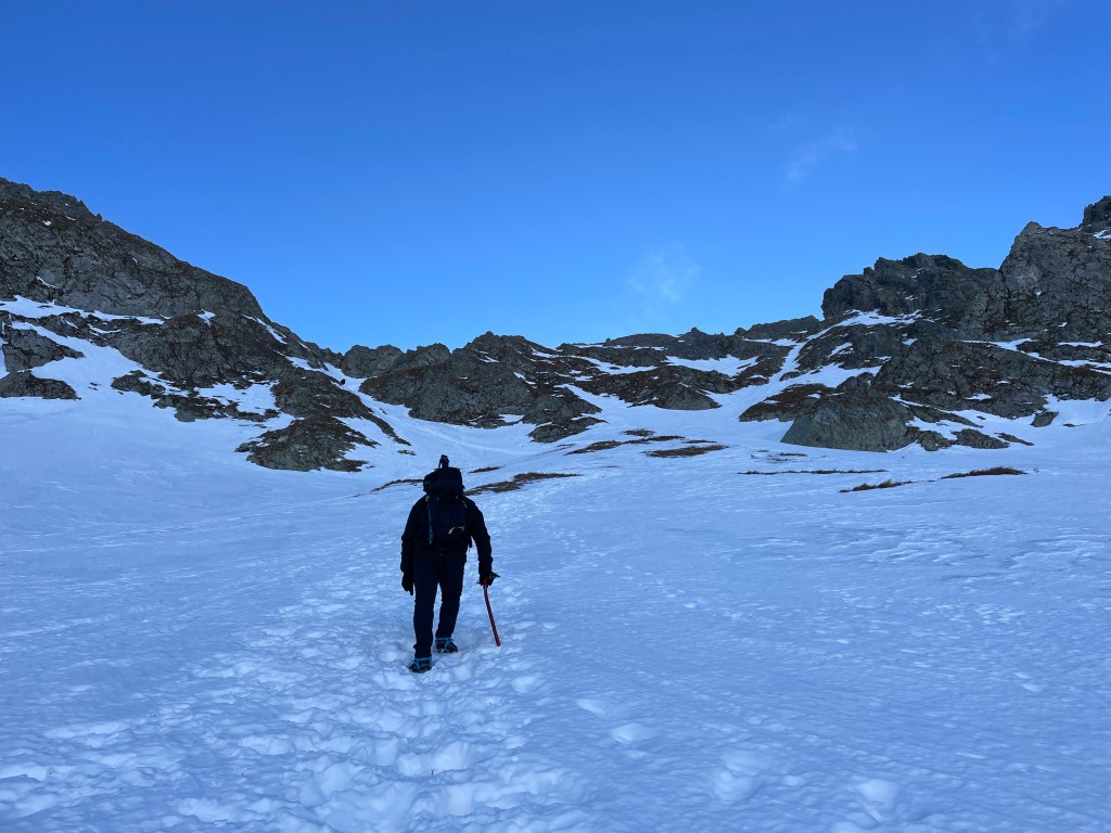 Palce zamarzają, a wieje co raz bardziej. Trzeba zacząć zejście. Idziemy uważnie wąską granią z powrotem. Już kilkanaście minut później robimy krótki postój na Szpiglasowej Przełęczy. Chowamy się przed wiatrem, żeby coś zjeść i napić się ciepłej herbaty. Krótki przystanek i zaczynamy dalsze zejście w kierunku Doliny za Mnichem, trawersując tym razem południowy stok Miedzianych skąpany w słońcu. Jest kwadrans po południu. Tutaj śniegu zdecydowanie mniej, mocno wytopiony, miejscami musimy przechodzić przez niewygodne trawiaste fragmenty. Co jakiś czas zatrzymujemy się i podziwiamy nowe dla nas widoki.