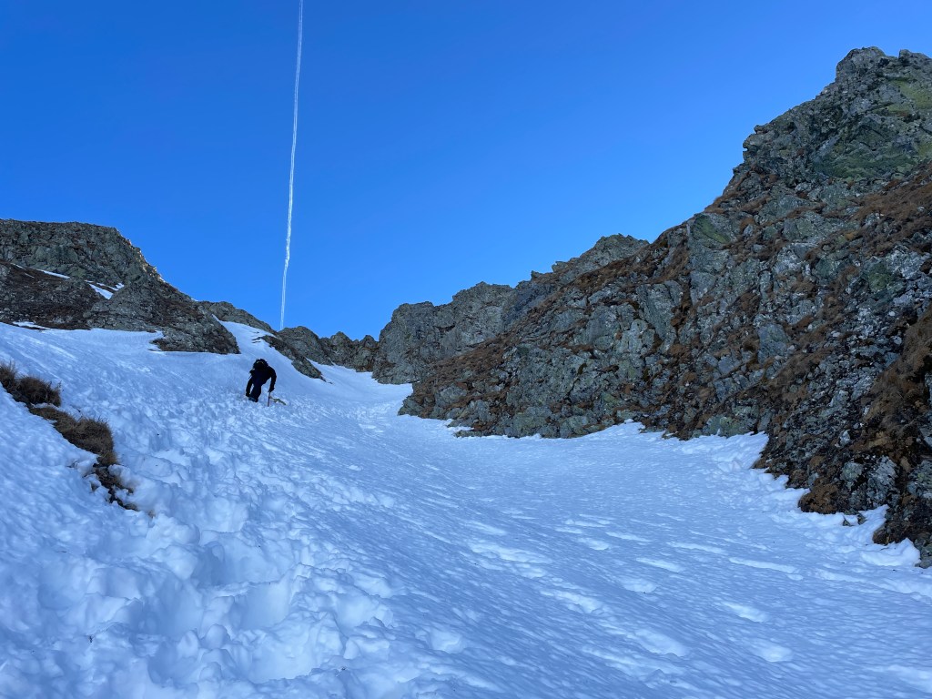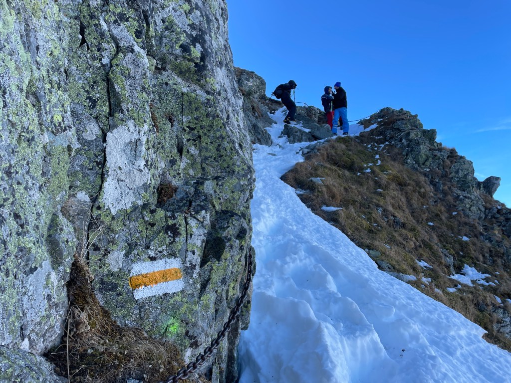 Podczas jednego z takich postojów Radek rzuca pomysł: może zdążylibyśmy jeszcze skoczyć na Wrota Chałubińskiego. Można by było skrócić drogą i zjechać na skróty na czekanie do czerwonego szlaku. Porzucamy jednak ten pomysł. Co chwilę spod śniegu wystają skały, zjazd nie byłby zbyt bezpieczny, a obejście oznaczałoby wydłużenie dzisiejszej trasy o kolejne 4 kilometry, czyli jakieś 2,5 godziny. Wrota poczekają…