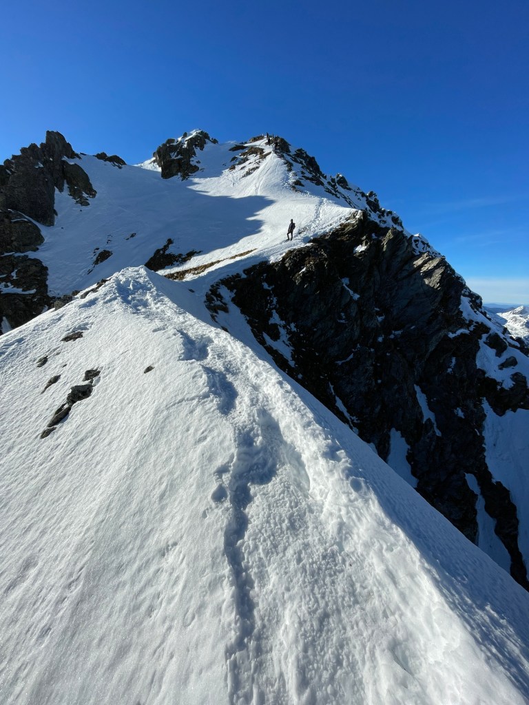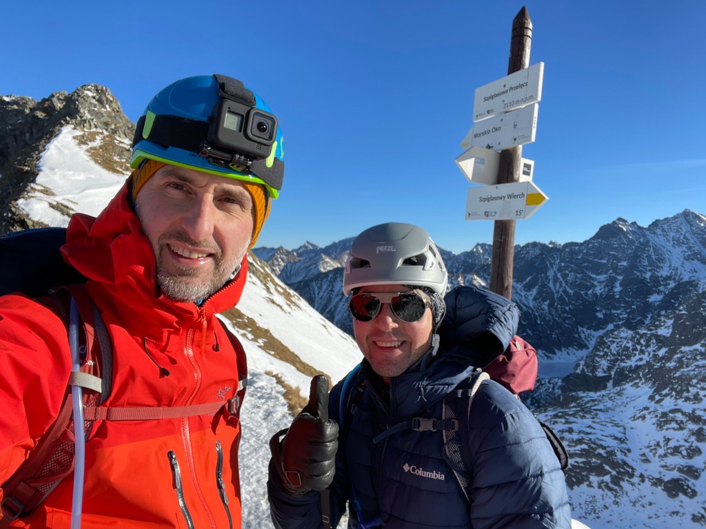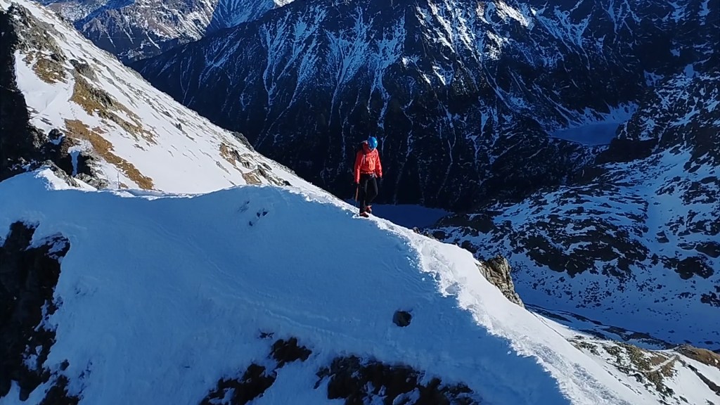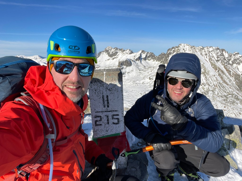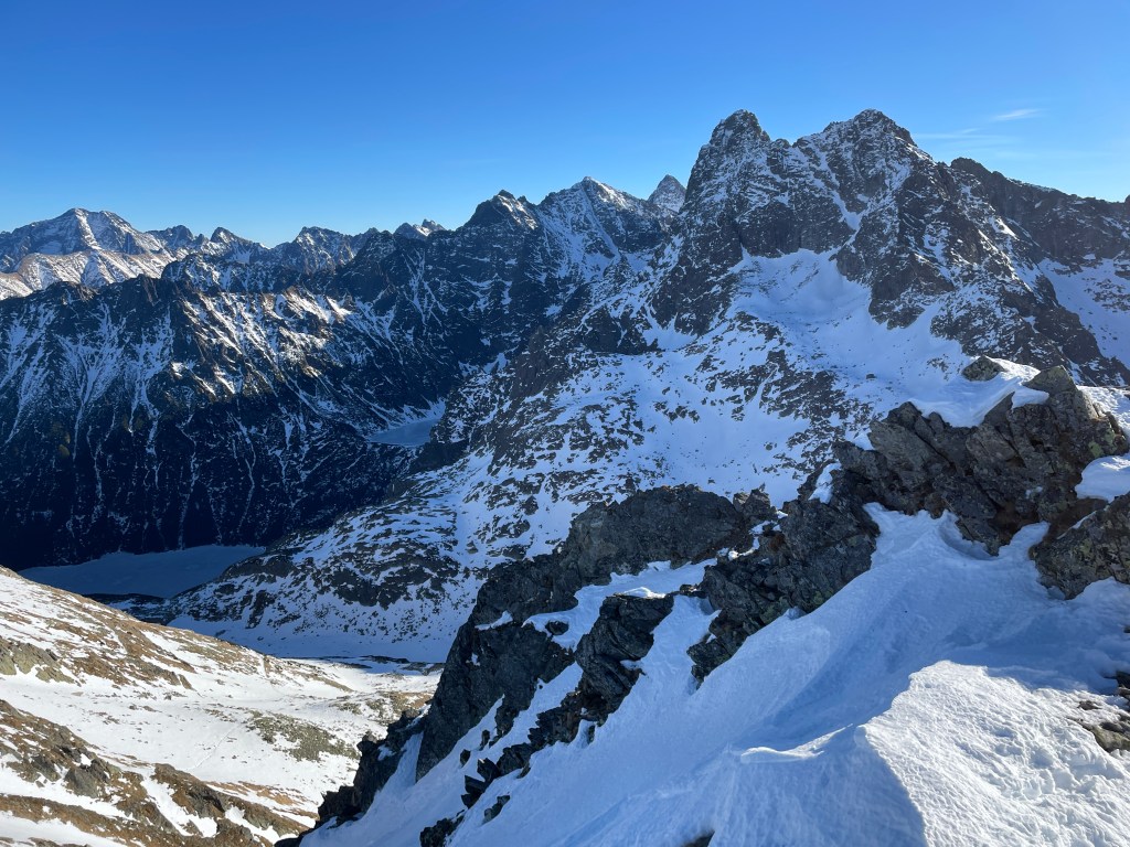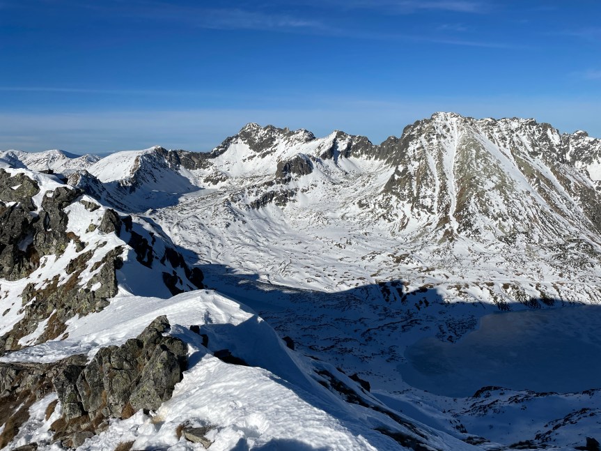 Ruszamy granią w kierunku szczytu i już po piętnastu minutach stajemy przy słupku granicznym nr II/215. Jesteśmy na Szpiglasowym Wierchu. Tutaj wieje mocno, ale nie przeszkadza mi to w zrobieniu pokaźnej ilości zdjęć i filmów. Na wierzchołku spędzamy dziesięć minut. Widoki fantastyczne w którą stronę nie patrzyć. Od zachodu doskonale widoczne Czerwone Wierchy, dalej patrząc na prawo Świnica, Kozi, Granaty i dalszy ciąg Orlej Perci po Buczynowe Turnie i Krzyżne, a dalej Wołoszyny. Odwracając wzrok na wchód możemy podziwiać piękną panoramę słowackich Tatr Wysokich z charakterystyczną sylwetką Lodowego Szczytu, następnie Rysy, Wysoką i wreszcie dostojną grań Mięguszowieckich Szczytów, po Koprowy Wierch i Grań Hrubego na południowym-zachodzie. Zaraz pod nami zamarznięta tafla Niżniego Ciemnosmreczyńskiego Stawu.