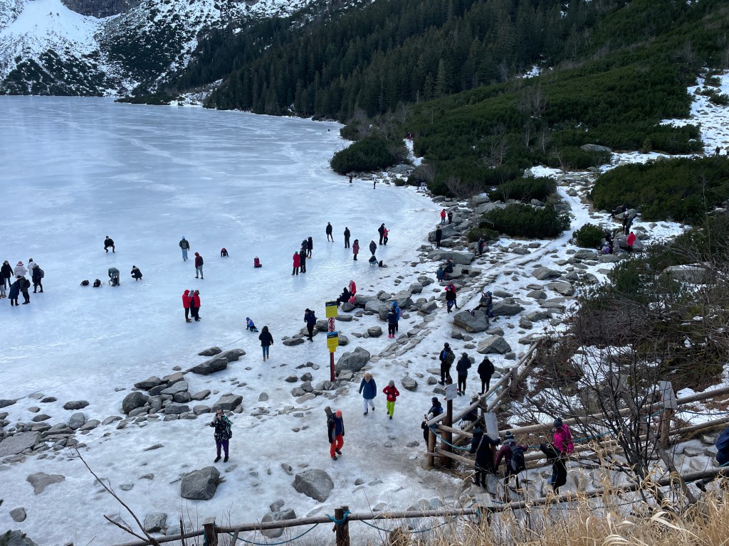 Teraz już tylko ostatni ośmio-klilometrowy spacer oblodzonym asfaltem w dół Doliny Rybiego Potoku. Zaraz po wyjściu ze schroniska: bęc! Raki schowane, raczki w ręce, jeszcze nie założone, a ja fikam orła na lodzie. Bogu dzięki nic mi się nie stało. Czym prędzej zakładamy raczki i już bezpiecznie schodzimy do samochodu zaparkowanego w Palenicy.