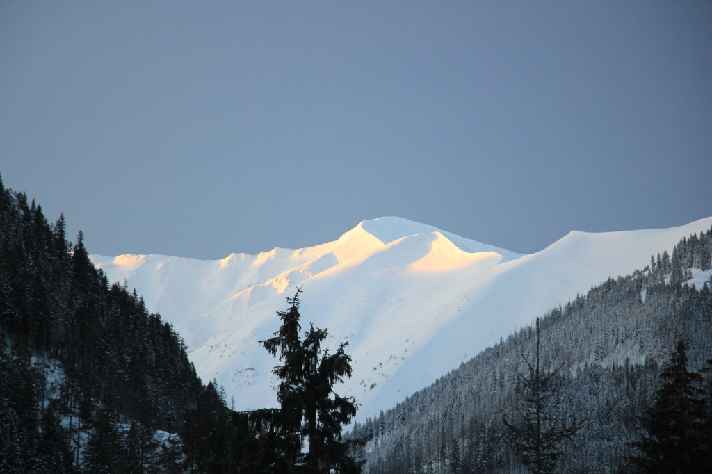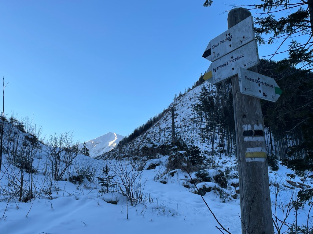 Na parkingu na Siwej Polanie meldujemy się na kwadrans przed 6. rano. Pierwszy, ponad pięciokilometrowy i niemal płaski odcinek zielonego szlaku przez Dolinę Chochołowską pokonujemy w godzinę chłonąc widoki ośnieżonych szczytów oświetlanych nieśmiałymi promieniami wschodzącego słońca. Na rozwidleniu szlaków obieramy kierunek południowo-wschodni, w stronę Doliny Iwaniackiej. Tutaj trasa pnie się już bardziej stromo w górę. Ścieżka wije się pośród świerkowego lasu, aby dotrzeć do kulminacji na leżącej na poziomie 1459 m n.p.m. Iwaniackiej Przełęczy, gdzie robimy sobie postój na śniadanie. Idąc dalej żółtym szlakiem w kierunku wschodnim w godzinę doszlibyśmy do schroniska na Hali Ornak w górnej części Doliny Kościeliskiej.