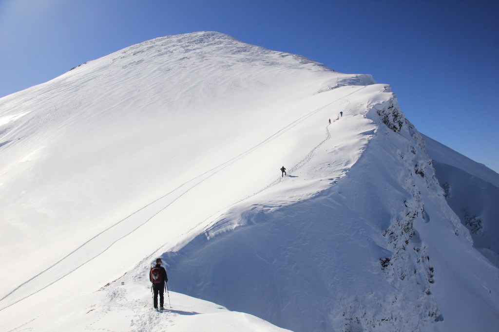 My jednak mamy plan ostro piąć się teraz w górę na grań Ornaków. W tę samą stronę kierują się też dwaj inni turyści, których spotykamy na przełęczy. Jeden z nich planuje, tak jak my, zdobyć Starorobociański Wierch. Drugi wybiera się na Błyszcz i Bystrą. Po wymianie kilku zdań i odpoczynku ruszamy na południe stromym podejściem o sporym nachyleniu sięgającym 30-40 st. Zimowy wariant wyznaczony jest w prostej linii, bardziej na prawo w stosunku do letniego szlaku, unikając niebezpiecznych lawinowo form wklęsłych.