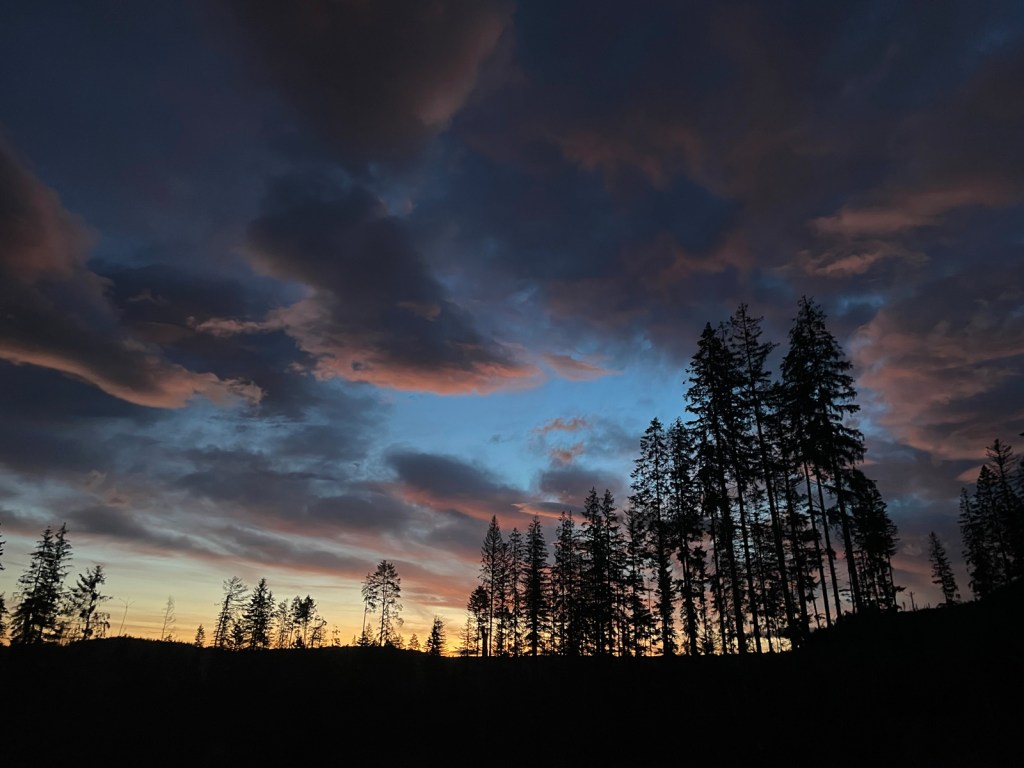 Godzina 5:45. Parking w Brzezinach po remoncie, ale jeszcze przed oficjalnym odbiorem, więc chwilowo darmowy. Stoi raptem kilka samochodów. Ruszamy z poziomu 1000 m n.p.m. czarnym szlakiem. Jak to przy halnym, powietrze jest przejrzyste, kolory nieba o brzasku obłędne. Ale wiatru póki co nie słychać. Na delektowanie się widokiem mamy tylko moment zanim ścieżka nie wprowadzi nas do lasu.
