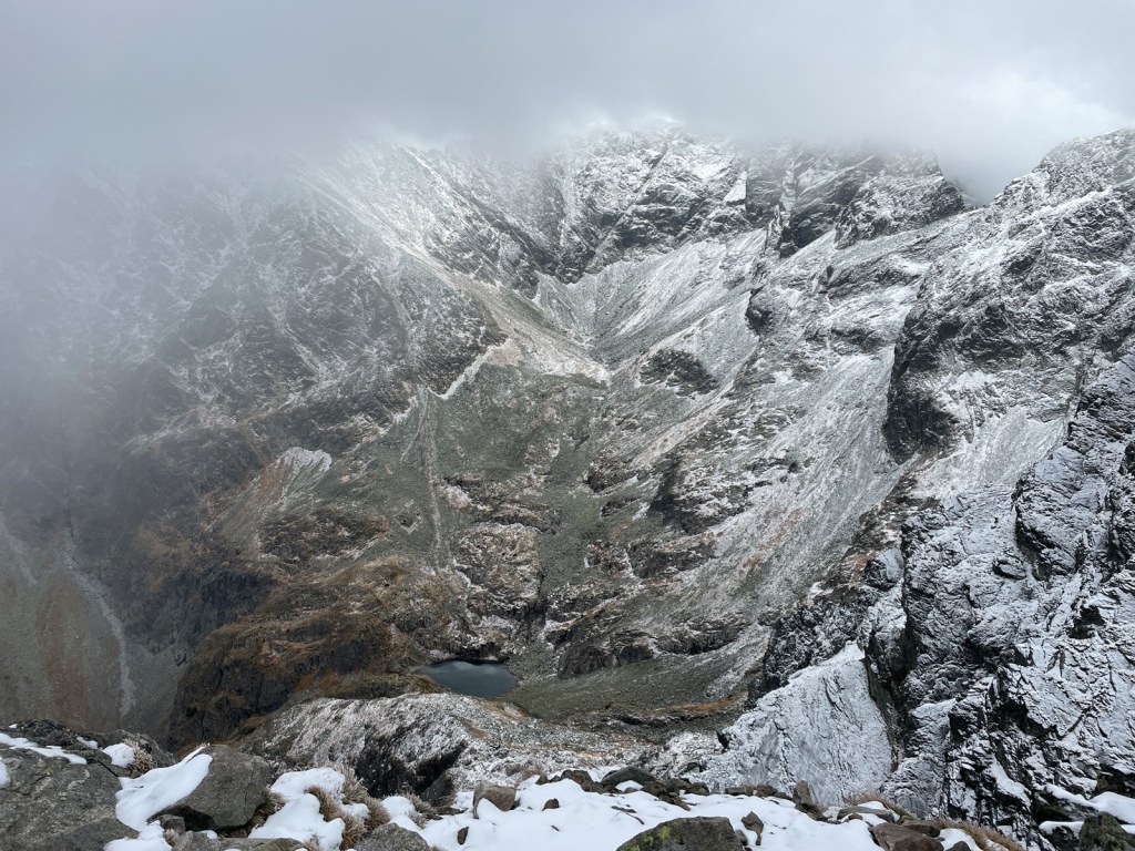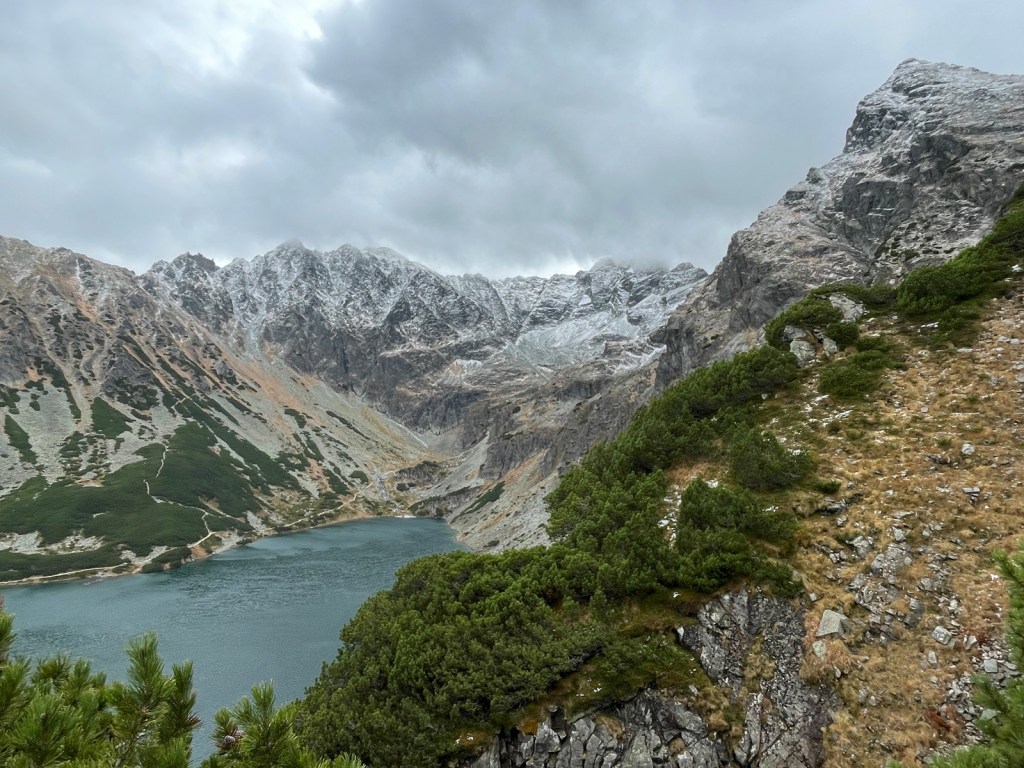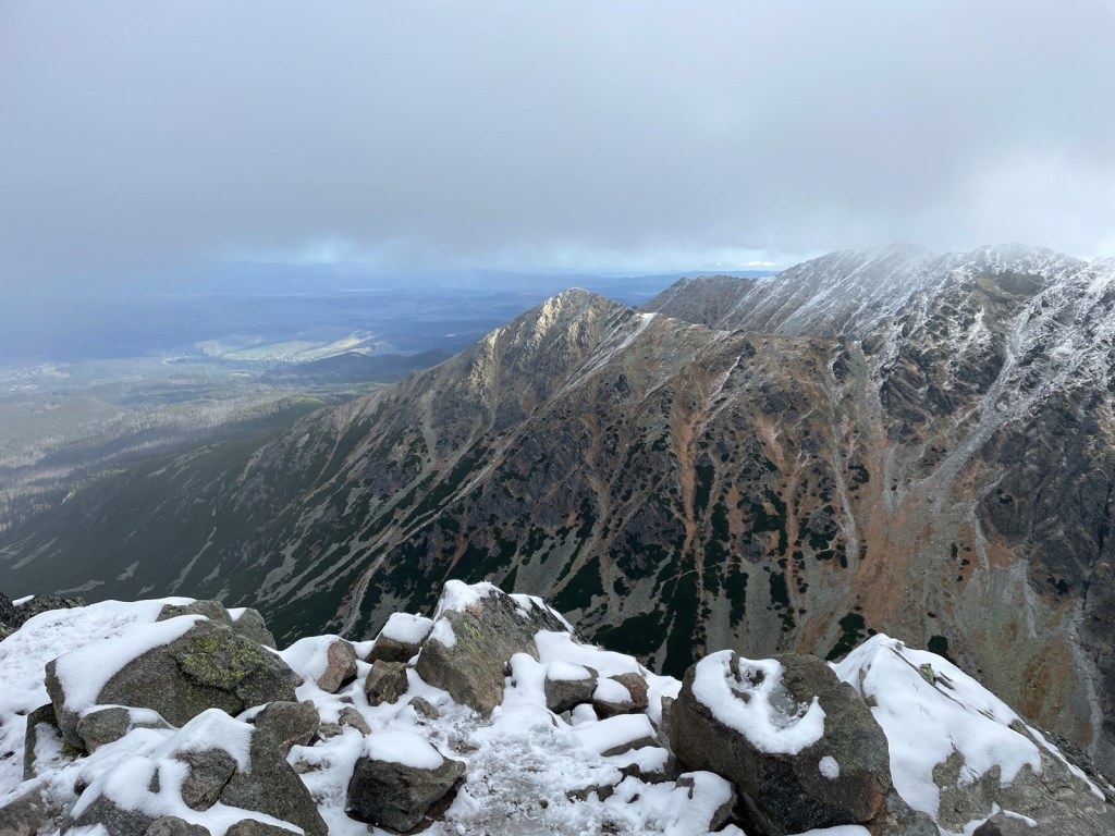Cała wizyta na wierzchołku zajęła nam dziesięć minut. Nie ma co liczyć na poprawę pogody i lepszą widoczność. Warunki nie sprzyjają dłuższej kontemplacji, czas ruszać w dół. Schodzimy, uważnie pokonując zmrożone trudności skalne, granitowe płyty, kominki i rynny. Czasem zatrzymuję się tylko, żeby uwiecznić na zdjęciu zieleń widocznej spod chmur Hali Gąsienicowej i turkus stawu kontrastujący z bielą ośnieżonego zbocza Kościelca. Czym niżej, tym niebo na północy się bardziej wypogadza, ale Tatry cały czas spowija gęsta pierzyna grafitowych bałwanów.