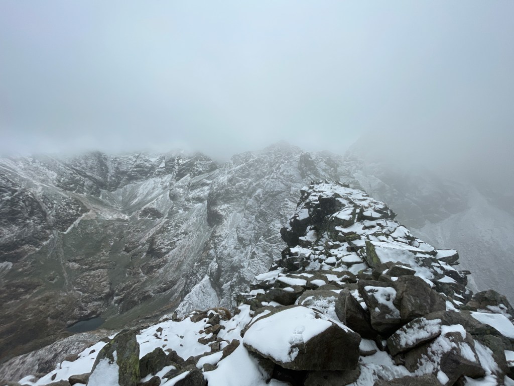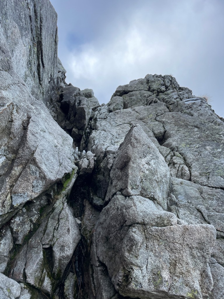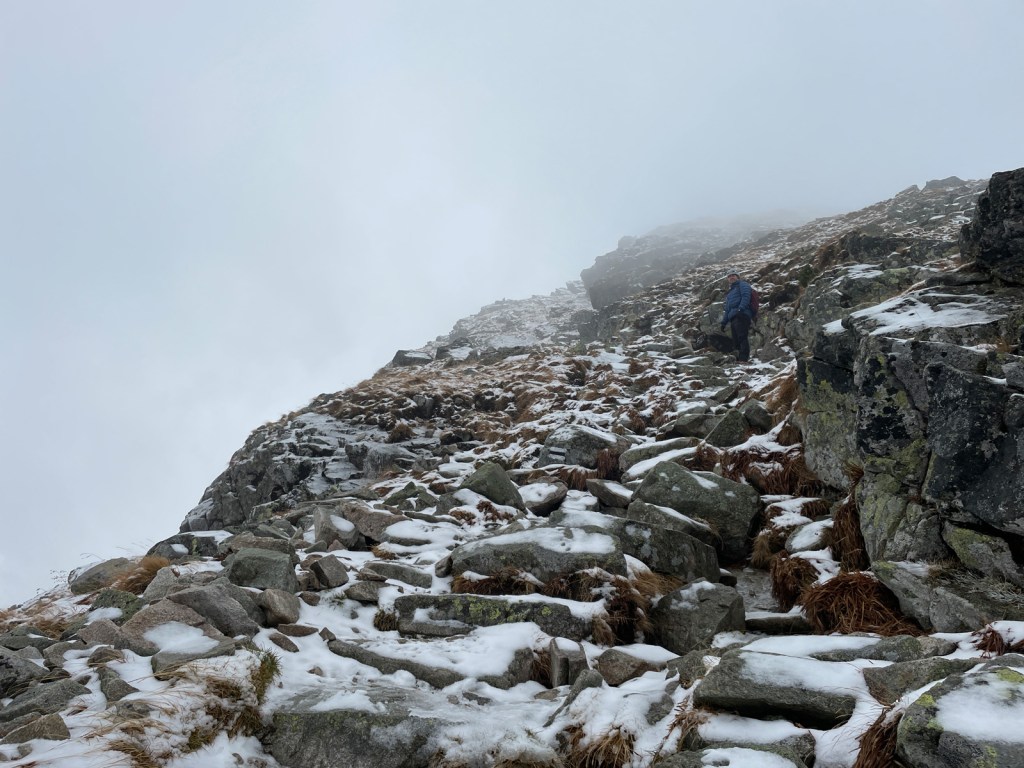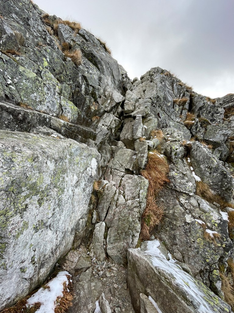 Chciałoby się gdzieś schować przed tymi podmuchami wiatru, odpocząć, nacieszyć widokami. Ale nie ma gdzie się schować. Trzeba więc przeć do góry. Mija godzina 9, a my niemal przebiegamy przez przełęcz, żeby zacząć mozolne podejście zakosami. Póki co skała jest lekko mokra, ale nie bardzo śliska, więc zakładanie raczków zostawiamy na później. Ja jedynie żałuję, że nie zmieniłem softshella na membranę, bo wiatr w najmocniejszych porywach daje mocno w kość. Obie rzeczy robię dopiero w połowie podejścia do szczytu, nieco poniżej poziomu 2000 m, kiedy zaczyna pojawiać się lodowa powłoka na skalnych stopniach. Dodatkowo, czym wyżej, tym bardziej przysypana śniegiem.